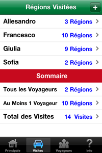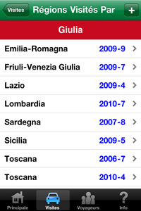 Avez-vous voyagé à toute les régions récemment en Italie? Souhaitez-vous un moyen facile de garder une trace de vos visites au cours des années passées et futures? Cette application permet de suivre des régions que vous et les membres de la famille et des amis ont visité, et permet également d'entrée de détails facultatifs qui devraient vous être utiles dans l'avenir. Inclut les dispositifs suivants: