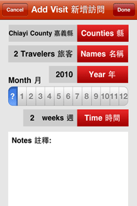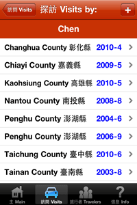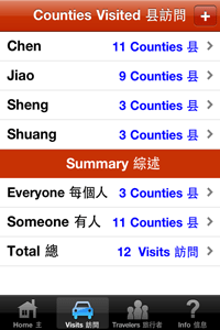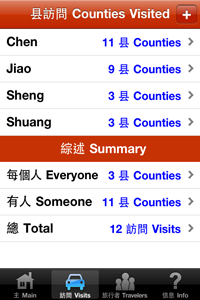 Have you traveled to any counties recently in Taiwan? Or provincial cities? Would you like an easy way to keep track of your visits over the past and future years? This app keeps track of the counties and provincial cities that you and other family members and friends have visited. It also allows you to input optional details that should be useful to you in the future. Includes the following features: