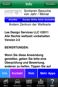 Haben Sie reisten in Länder rund um die Welt vor kurzem? Wollen Sie den Überblick über Ihre Besuche in Ländern halten über die Vergangenheit und die kommenden Jahre? Diese App verfolgt die Spuren der Länder, die Sie besucht haben. Es ermöglicht auch Eingang optional Details, die für Sie nützlich sein sollte in der Zukunft. Umfasst die folgenden Features: