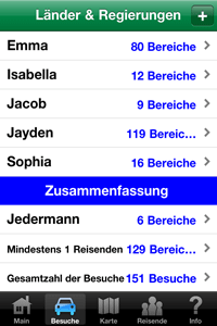 - Merkt sich die Länder / Gebiete jeder Person besucht hat.